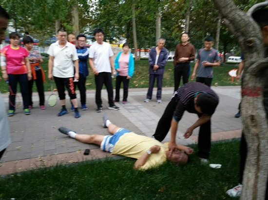 挺身而出 積極施救 2016年9月27日早上6:40時(shí)許,秋日的氣溫已經(jīng)有些偏低。從外地到淄博高青縣工作的閆澤強(qiáng)在蘆湖公園晨練跑步過程中突感身體不適,一下子癱倒在跑道上。旁邊的市民見狀,詢問要不要撥打120救治,閆澤強(qiáng)擺了擺手,并試圖站起來。但是他并未站穩(wěn),就仰面躺在了路邊的草叢中,徹底喪失了意識(shí),隨身攜帶的眼鏡和鑰匙也散落在一邊。看到陌生人暈倒,很多晨練的人就慢慢圍攏了過來,有的市民還想和他對(duì)話,但是沒有任何反應(yīng)。此時(shí),也正在附近晨練打球的高青縣市民陳磊見此情景,也趕緊跑到出事現(xiàn)場(chǎng)。當(dāng)看到圍觀的市民對(duì)患者救治一愁莫展時(shí),出身中醫(yī)世家的陳磊,懂得一些醫(yī)學(xué)救護(hù)常識(shí),看到這突發(fā)情況,判斷患者有可能遭遇到了危重病癥,便立即展開緊急施救。