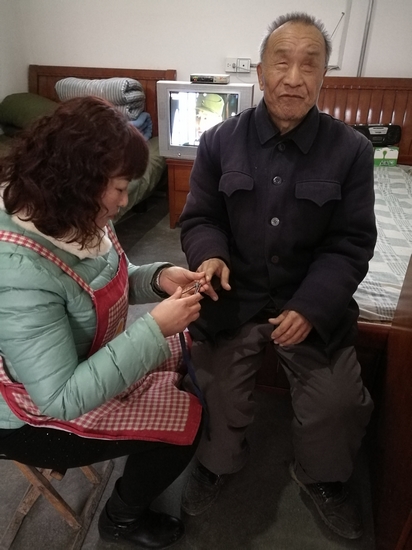 84歲的李光榮老人,生活不能自理,一天到晚總是躺在床上。每天早上,吳本鳳第一件事就是給他端屎端尿,再就是口渴了給他端水,一年四季天天如此,她從來(lái)不嫌不煩。家是高莊的老人張宗和每天早上看到吳本鳳給他倒尿盆,總是過(guò)意不去,積極配合,爭(zhēng)著倒水沖刷痰盂。小吳也總是笑著說(shuō):“沒(méi)事,我就是干這的,我來(lái)吧!”東河北的張?jiān)龈:腿螁⒛罾先硕际菤埣踩耍麄兊哪_都是一只朝前一只朝后,大小便不能自理,吳本鳳總是用手拿著痰盂子給接尿,感動(dòng)的兩位老人逢人就夸并歉意地說(shuō):“我們可是真難為這閨女了。”