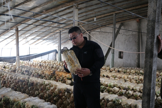 翟海龍查看食用菌種植情況