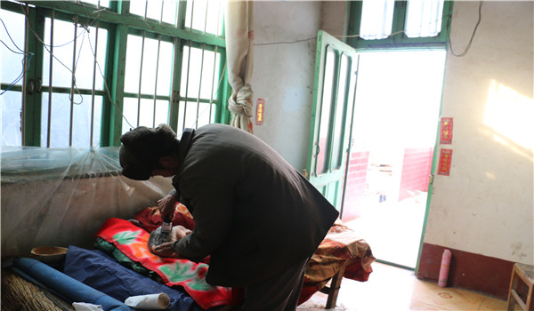 上天好像就是要考驗張明利的孝心,2012年冬天,張明利88歲高齡的母親也病倒了。既要照顧妻子,又要照顧母親,張明利只好兩邊跑,白天用三輪車推著奶奶去打針,晚上就拿著一床草墊子鋪在地上,睡在奶奶床邊,早上起來先給奶奶吃好早飯,再回家給妻子做飯,清理雜物完畢后,再去照顧母親。因為子女都在外地打工,所以張明利從不麻煩子女,自己頑強的支撐著這個風雨飄搖的家。2013年春天母親帶著兒子的孝心安詳的走了。張明利用實際行動為子女上了人生中最重要的一堂孝道課。