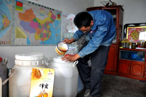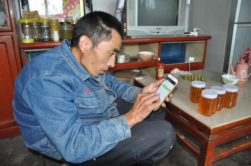 王士國從手機上與客戶聯系銷售蜂產品