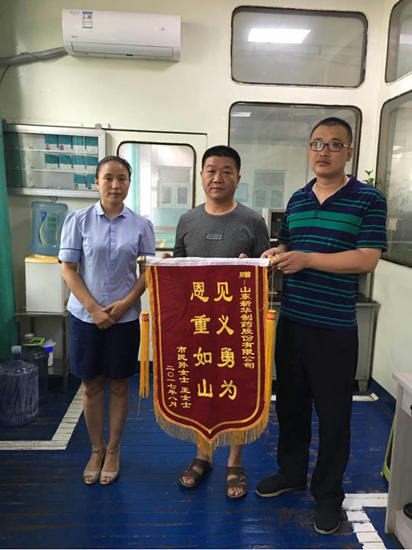 15日上午8點,孫女士和丈夫劉先生及同事王彥靜來到山東新華制藥股份有限公司一分廠,為義救三人的陳建軍送上錦旗和鮮花。