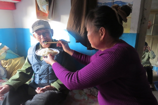 姜秀珍(右)為公公喂飯