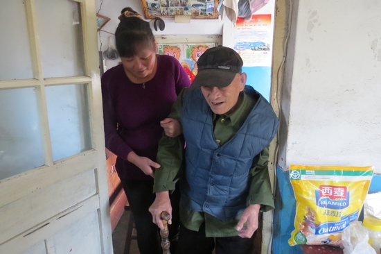 姜秀珍(左)扶公公外出散步