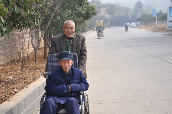年輕時劉廣成的腿不太好,曾經受過傷,打過鋼板。隨著年紀的增長,父親的身體開始走了下坡路。幾年前,因不小心摔倒而導致左臂骨折,住院期間是劉學科跑前跑后地照顧,出院后又接到自己家來住,經過三個月的靜養骨折康復了。過了不久,劉廣成的左手腕又不幸扭傷,也是在劉學科的照顧下很快恢復了起來。2013年,上了年紀的劉廣成因走路滑倒扭傷了腰,從此,老父親再沒能站起來,只能靠坐輪椅出行,同時也失去了生活自理的能力。劉學科對父親形影不離地照顧也是從這一年開始的。