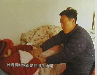 妻子完全殘廢,趙奉營天天給妻子喂飯,一個女兒上學,趙奉營家里地里來回跑,成天忙得團團轉。妻子看著十分心疼,實在不,忍心拖累丈夫,幾次想尋短見,但都被趙奉營攔下。他耐心勸說妻子不要想不開,就是有一絲一毫的希望也要爭取活下來,不能讓唯一的女兒沒有娘。