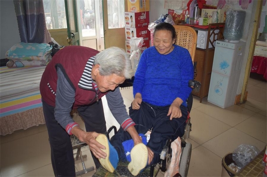 二十年前,宋美榮的兒媳牟小徐騎自行車摔傷,導(dǎo)致雙腿完全沒有知覺,癱瘓在床。宋美榮兒子需外出打工賺錢,宋美榮就挑起了家庭的重?fù)?dān),照顧兒媳還要照顧未成年的孫子孫女。給媳婦擦身、翻身、按摩、換洗衣服、喂水喂飯成了宋美榮每天的“功課”。“她不吃也先給我吃”兒媳這樣說到。一天三頓,每頓都有肉菜、素菜和湯菜,每次吃飯宋美榮都是先給癱瘓的兒媳端到跟前,讓兒媳吃完她再吃,有時候照顧兒媳和孫子孫女太累了,她也就不吃了。