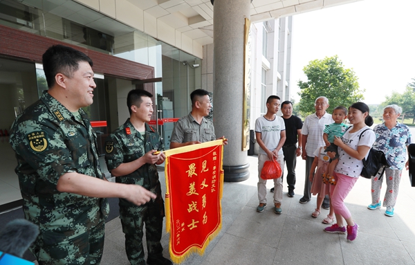 當(dāng)所有人的目光都集中在蘇醒過(guò)來(lái)的小男孩身上時(shí),趙士軍卻悄悄的離開了圍觀的人群,返回家中。第二天,接到了任務(wù),提前結(jié)束休假,返回了駐地。歸隊(duì)的趙士軍一如既往的出操、訓(xùn)練、執(zhí)勤戰(zhàn)備,沒(méi)有和任何人說(shuō)起自己見(jiàn)義勇為的經(jīng)歷,直到被救孩子的父母拿著錦旗來(lái)到支隊(duì)。