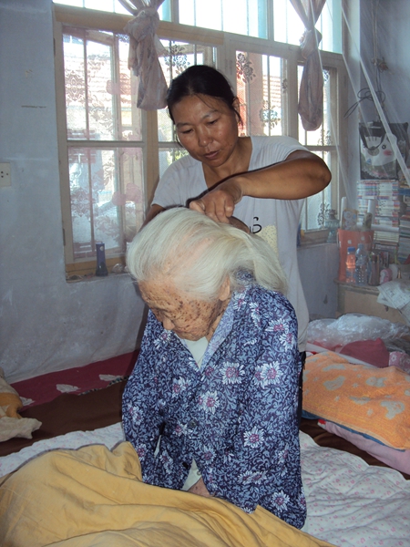 為此,從新婚第二天開始,她便脫下紅嫁衣,換上舊衣裳,把照料老人當(dāng)成了自己的責(zé)任,與丈夫一起挑起這副沉重的生活擔(dān)子。由于當(dāng)時90多歲的太婆婆,已經(jīng)癱瘓在床多年,吃喝拉撒完全依靠別人。為了照顧太婆婆,尚慶霞自己放棄了原本屬于她那個年紀(jì)的娛樂活動,甚至沒有時間去城里為自己添置一件新衣服。每天,她早早做好飯菜送到老人床前,核桃粉、芝麻糊、水煮蛋這樣的營養(yǎng)品一直沒有斷過,天天換著花樣給太婆婆補充營養(yǎng)。雖然癱瘓在床,尚慶霞卻把老人收拾的利利索索,干干凈凈。公公逢人便夸:“我命好攤上好兒媳,她性格好,人善良、正派,聰明伶俐。每天都給她太婆婆洗頭、洗臉、按摩,睡前用熱水洗腳,隔三差五洗身子、剪指甲,無微不至,這是我們?nèi)业母7帧!?/p>