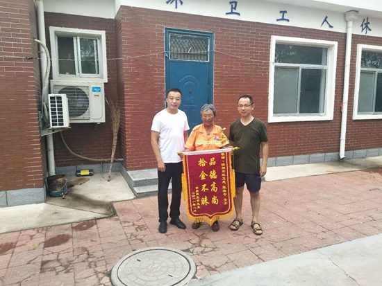 2018年8月3日清早,王煥令在責任區域清掃路邊衛生時,發現綠化帶旁邊一個公文包和一瓶高檔白酒,公文包內有現金及身份證、銀行卡。王煥令立即將此事報給轄區隊長,在隊長和公司工作人員的努力下,當天找到了遺失物件的失主。失主趕到環衛工人休息室,對王煥令表示感謝,并拿出1000元現金,被王煥令婉拒。事后失主特意為她送上錦旗表達謝意。