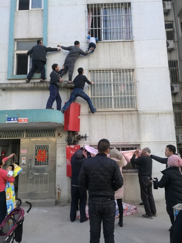 12月14日,石臼街道林海小區一位三歲孩子,頭卡在窗戶外的護欄上,身子懸在半空。看到這一幕的鄰居們紛紛行動起來:有人在下面撐上被子;有人組成“最美人梯”托住孩子;有人試圖破門進入房屋……最終有驚無險,孩子身子被救回了房間。