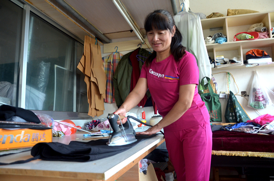 小小的屋子,設備十分齊全。一張大案板占據了屋子的大半個地方,上面放著熨斗、大小剪刀、畫筆、尺子等,靠窗處是一臺縫紉機,擦得锃亮,上面還有一件襯衣,已經縫制得差不多了。記者看得出來,肖海燕對每個工具的用途了如指掌,也倍加愛惜。見記者盯著一排新做好的衣服看,肖海燕高興地為記者展示:御寒的外套、毛衣、棉褲……天氣漸涼,從初秋時節,肖海燕就開始趕制一批冬裝。撫摸著自己親手做出來的衣服,肖海燕的臉上洋溢著燦爛的笑容,好像想到了這些衣服送到被需要的人們手中時,大家領到衣服后開心的樣子。