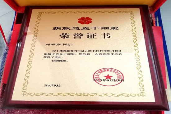 劉祥彥的《捐獻造血干細胞榮譽證書》上寫到,劉祥彥同志:為了拯救患者的生命,您于2019年1月10日捐獻了造血干細胞。您的這一人道善舉使患者獲得了重生。