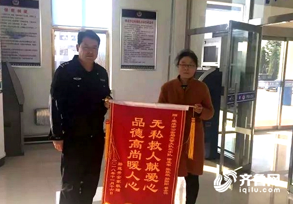 11月19日,駕駛?cè)硕车钠拮与徯銛y帶錦旗來到交警大隊(duì),對(duì)民警和輔警隊(duì)員表達(dá)真摯的感謝。她表示,丈夫已無大礙,是民警舍身救人,挽救了丈夫的性命,挽救了她的家庭,感謝救人的徐發(fā)軍,感謝榮成交警。