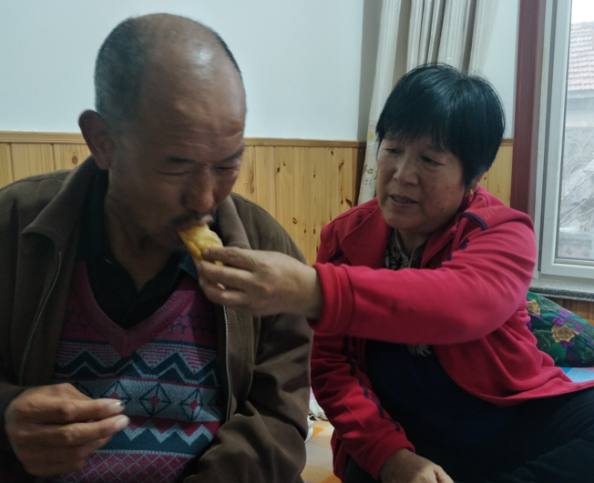 早年是母親王孫氏做給他吃,雞蛋煮熟了得剝了皮送給他,吃藥得遞在他手里。“接力棒”在手,王玉芳平靜地接受了這個現實,而每當被發病的叔叔罵得委屈掉淚時,想想他不是一個正常的人,心里也就釋然了。為了父親的囑托,為了家庭的祥和,她義無反顧地承擔起一個做女兒的神圣職責。王秀海胃口好飯量大,餃子能吃三碗,每天都是她做好了飯菜,端到眼前,招呼著他吃飽;每次趕集買回水果,都是先讓叔叔吃夠;至于洗澡、理發、刮胡子、剪指甲、倒尿壺、縫洗衣被這些活兒,都是王玉芳一手操辦。有時,他大小便失禁拉了褲子里,王玉芳便像伺候小孩一樣,給他一點點清理洗凈。如今,王玉芳的母親年紀大了,患有冠心病、肺氣腫,常年打針,一年得住一兩次院,一時也離不開人,叔叔隨著年紀越大也越難照顧,王玉芳重任在肩;從方便治療、康復考慮,應把母親接到城里住,但無論如何也不能忍心把叔父撇在家里,王玉芳大義取舍。