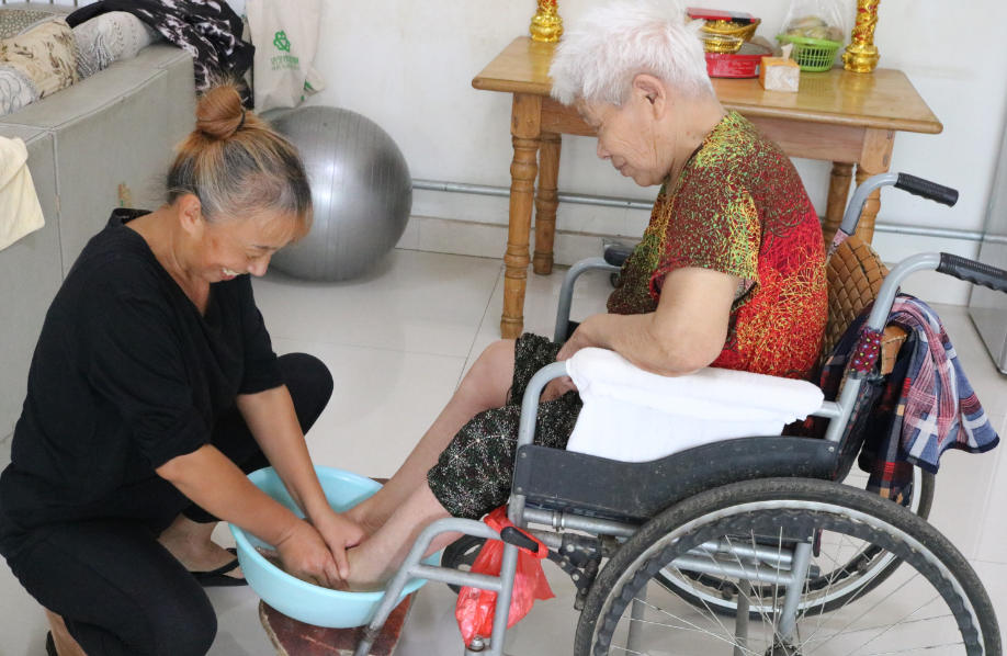 眼看著侄子健康成長,日子剛有了起色,意外再次打破了這個家庭的平靜。2011年5月,婆婆患上了腦出血,癱瘓后的婆婆生活起居不能自理,全天需要人照顧。許求萍幼年喪母,享受的母愛寥寥無幾,自從進了婆家門,她總感覺自己終于有了媽,便把婆婆當親生母親一樣疼愛。多年來,從未和婆婆拌過嘴、吵過架,娘倆總有說不完的家常話,左鄰右舍都對她們羨慕不已。婆婆生病期間,許求萍更是盡心伺奉、親力親為。為了方便照顧婆婆,許求萍每晚都陪著婆婆一起睡,為讓婆婆睡眠質量好一些,她每晚都用溫水給婆婆泡泡腳。無論春夏秋冬,許求萍每天五點半準時起床,給兩個孩子做飯,送侄子上學,回來后伺候婆婆穿衣喂飯,收拾家務。夏季時,每天給婆婆洗澡,換洗衣物,照顧婆婆大小便,定期為婆婆清洗被褥、理發、剪指甲。她總是開玩笑說,自己都快成一個理發師了。婆婆臥病在床期間,身上沒有褥瘡和一點腐爛之處。經過她的精心伺候,婆婆目前的身體有了很大好轉,天氣晴朗的時候,她便用輪椅推著婆婆出去曬曬太陽、散散心,想著辦法哄老人開心。