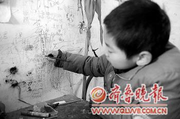 9歲的健健在家里的墻上寫下他的大學生家教老師的名字,大學生們的名字已經寫滿了這面墻。 本報記者 陳洋洋 攝