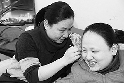 上中學后,劉國華的學業負擔日益加重,韓偉曾想把寶印送到康復中心。“康復中心患者多,妹妹又不會說話,能過得好嗎?我辛苦點沒什么。”她勸說父母放棄了這個念頭。近20年里,除了在外上大學,國華沒有一天離開過寶印。直到現在,33歲的姐姐還是一口口含著藥喂31歲的妹妹。喂上藥,再用小勺喂水,然后擦干凈嘴角。“中藥很苦,用小勺喂,寶印不吃,還會打翻勺子,只有一口口地喂,她才肯吃一些。”2009年,寶印被查出患上糖尿病,國華每天要給寶印打三次針。在一次打針時,國華發現針管中有血。為了不讓寶印受苦,劉國華竟在自己身上試針,掌握好力度、找準位置后,才敢給給妹妹下針。