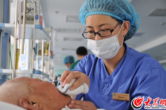大眾網濟南9月16日訊記者 于瀟瀟)ICU又稱重癥監護室,這里集中了醫院里病情最重、最危急的病人,需要時刻有人看護。在日照市中醫醫院腦病三科重癥監護室(ICU)里,護士郭金鳳已經工作了8年多,把自己的青春獻給了ICU這一特殊的護理崗位。
