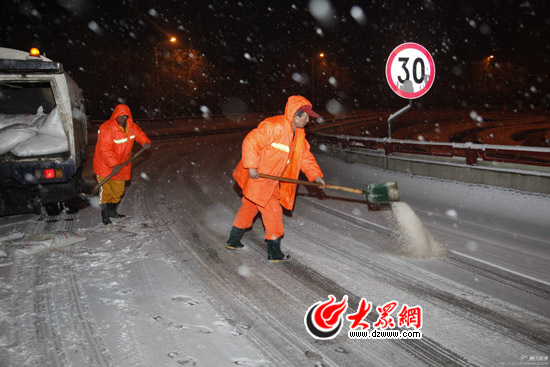 在濟南市區(qū)高架橋上,環(huán)衛(wèi)工們正在撒融雪劑。
