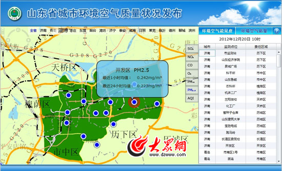 其中,在PM2.5實時數據方面,記者隨機調出了濟南各監測點的數據發現,開發區、省種子倉庫和寶勝電纜等市區東部的3個監測點的最近1小時PM2.5均值都在0.2毫克/立方米以上,最近24小時均值開發區監測點達到了0.223毫克/立方米,按照環保部最新發布的《環境空氣質量標準》(GB 3095-2012),限值75微克/立方米的標準,開發區超標近三倍。