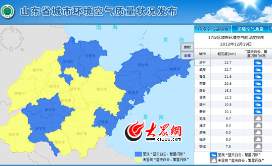 今天起,我省17市實時公布PM2.5數據,大眾網記者從省環保廳官網看到,在全省環境空氣能見度方面,濟寧、威海和青島等8市能見度達到了“藍天白云、繁星閃爍”的標準;在PM2.5實時數據方面,濟南東部PM2.5明顯高于市區。