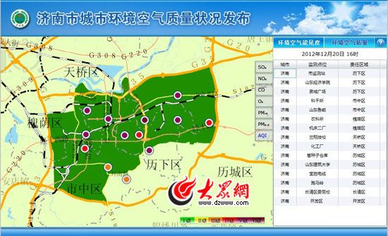 今天下午,記者通過查看濟南市城市環境空氣質量發布平臺發現,在全市15個監測點最近24小時的AQI數據中,市區有8個監測點的空氣質量等級達到了“重度污染”,僅有跑馬嶺1個監測點空氣質量達到了“良”,其余6個監測點為“輕度污染”或“中度污染”。