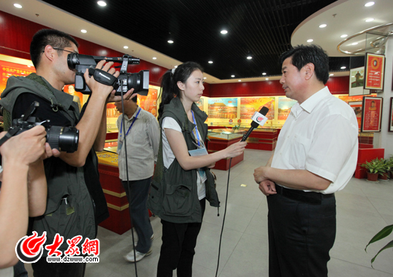 牡丹區區委書記劉傳謹(右一)接受大眾網記者韋輝(左一)、姜洋(左二)采訪。(盛堃 攝影)