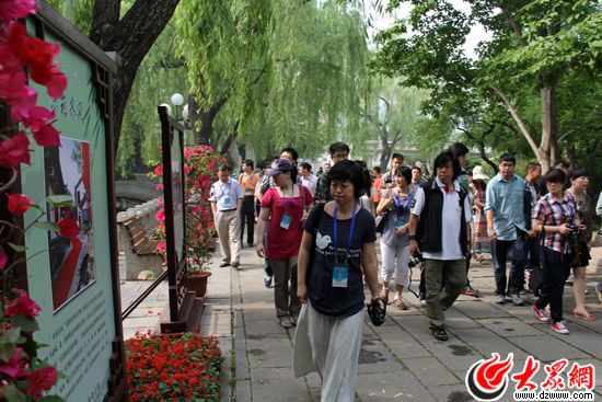 采訪團參觀趵突泉及濟南市文化建設展板。(馬鑫 攝)