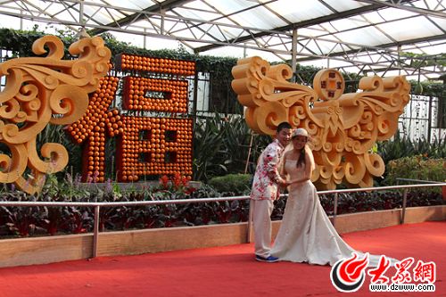 一對壽光的小兩口更是把菜博會作為自己婚紗照的外景地。(馬鑫 攝)