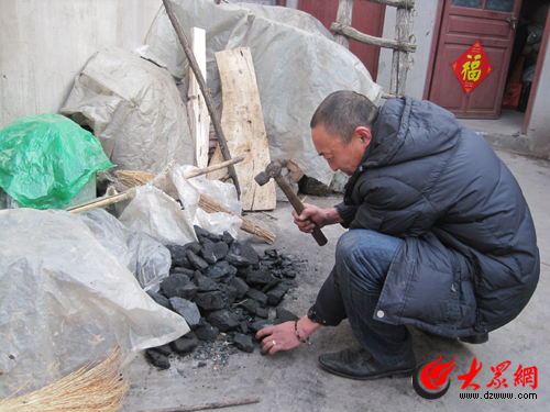 唐慎山在收拾家里用來取暖過冬的煤炭