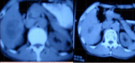 楊XX,男,67歲,退休工人,家住黑龍江雞西市。該患于2008年3月因肝左葉癌在哈爾濱醫科大學二院行肝左葉切除術,術后三個月復查肝CT及MRI示肝右葉轉移,遂于當地礦務局總醫院做了一次血管介入化療栓塞治療。三個月后復查再次出現肝右葉3個轉移灶,其中最大的直徑達5.5cm,又在雞西市中醫院腫瘤科做了一次射頻消融治療。當時只對最大的轉移灶進行了處理,小的沒做處理,患者從確診以來一直在積極求治,結果是一邊治療一邊轉移,最后一次治療結束后,家屬決定讓病人試一試中醫。于是該患者于2008年11月末開始到市中醫院腫瘤科求治與本人,經采用“董氏調胃、強腎、止血、化巖治癌法”治療,患者服藥2個月后復查肝CT及彩超均未提示肝臟有另外兩個小轉移灶,而最大的轉移灶也明顯變小為2.5x3cm,繼續治療三個月復查肝CT及MRI均提示射頻消融術后改變。之后多次復查均為肝左葉切除術后改變,肝右葉射頻消融術后改變。回訪至今患者一切如常,患者已無病生存3年。
