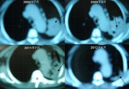 [提要] 患者李某某,女,64歲,于2009年6月因咳嗽、喘憋、痰中帶血,經CT及病理等相關檢查確診為右肺上葉粘液腺癌, 縱膈淋巴結轉移, 左胸膜轉移,胸腔積液,因病情及體質的原因無法接受手術及放化療等殺傷性治療,采用"中醫調胃、強腎、止血、化巖法"先后共治療8個月,現患者已有質量的存活近3年。目前隨訪患者飲食、睡眠、體力均好,可獨立完成日常家務,如今患者已經67歲。肺癌病人李XX的病理圖片肺癌病人李XX采用“董氏治癌法”治療前后CT變化