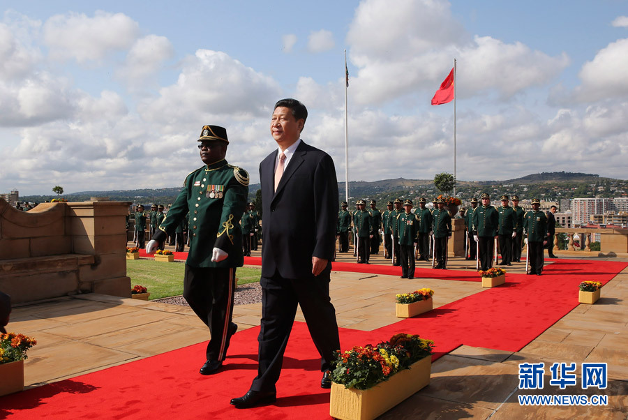 3月26日,南非總統祖馬在比勒陀利亞聯邦大廈前廣場舉行儀式,歡迎中國國家主席習近平訪問南非。這是習近平檢閱儀仗隊。 新華社記者 蘭紅光攝