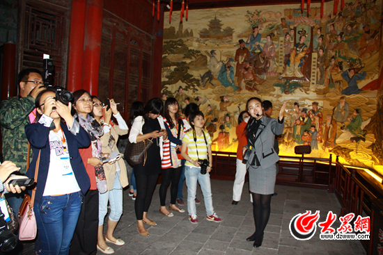 采訪團成員在蓬萊閣風景區參觀有關八仙過海神話的雕刻 記者 張帆 攝