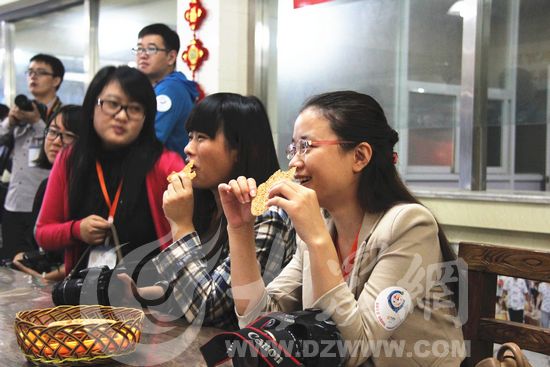 采訪團記者們在大街上的周村燒餅博物館內品嘗剛出爐的周村燒餅。見習記者 馬俊驥攝