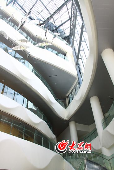 今天上午,采訪團來到牟平文化中心,遠遠便看到菱形鋼化玻璃組成的不規則的幾何體建筑,在陽光下越發晶瑩剔透,廣場布局錯落有致,高低起伏的綠草樹木,清水蕩漾的景觀池,與一路之隔的沁水公園相呼應。