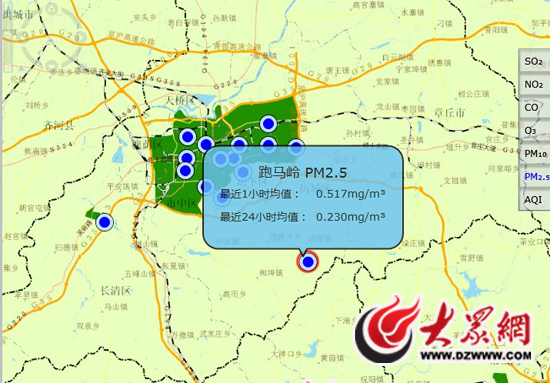 此外,根據統計,除了市監(jiān)測站、科干所、開發(fā)區(qū)3個監(jiān)測點周圍的首要污染物為可吸入顆粒物PM10以外,全市其他12個監(jiān)測點統計的首要污染物均為PM2.5。其中,被稱作濟南“后花園”的跑馬嶺監(jiān)測站最近1小時檢測到的PM2.5均值最高,為0.517mg/m?,超出國標6.9倍。泉城廣場、長清區(qū)委黨校監(jiān)測到的最近1小時均值超標也達到4倍。