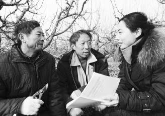 2012年12月12日,棗莊市山亭團區委派駐店子鎮苑莊村“第一書記”高曉娟(右)在果園向農民宣傳十八大精神。10多年了,... 全文>>