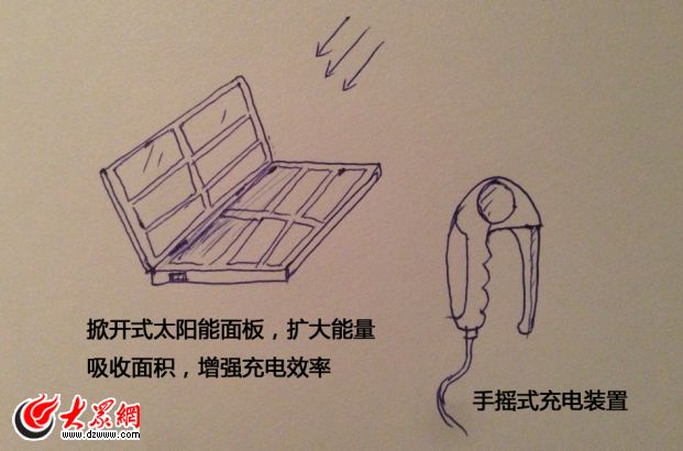 目前市面上的移動電源,本身需要接數據線充電,而本產品面板自帶太陽能面板,可隨時為移動電源充電,另外還有小型手搖外接充電裝置,在沒有任何外部電力的情況下可手動為移動電源充電,是一款適合戶外運動的新型移動電源產品。當然,在正常有電環境時,該產品也可使用常規的充電接口進行充電。