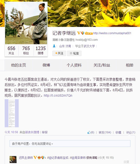 8月28日上午,@記者李繼遠在其個人微博中稱“8月4日,林飛以拉面有味為由故意生事,實則是希望張生民盡快搬走,以便拆遷!彪S后,這一消息再次受到微博熱炒。