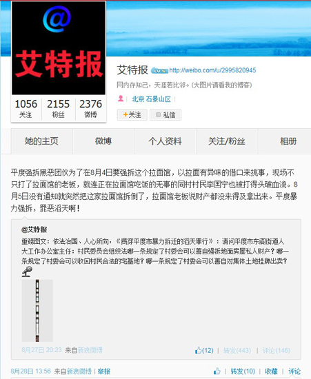 隨后,@艾特報等微博賬號開始不斷攻擊本網調查真實性。并由此得出“新陰謀論”、“設局說”,指責“平度強拆黑惡團伙為了在8月4日要強拆這個拉面館,以拉面有異味的借口來挑事,現場不只打了拉面館的老板,就連正在拉面館吃飯的無辜的同村村民李國寧也被打得頭破血流。8月5日沒有通知就突然把這家拉面館拆倒了,拉面館老板說財產都沒來得及拿出來。平度暴力強拆,罪惡滔天啊!”