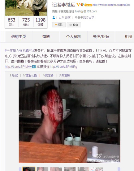 8月24日,《華夏時報》刊發的名為《陳寶成抗拆事件慢鏡頭》的文章和微博用戶“@記者李繼遠”(實名認證為“華夏時報駐山東站記者”)的新浪微博上同時提到了一件事,大體內容為:8月4日,百名村民聚集在東關村張老五拉面館抗議拆遷。不明身份人員將村民李國寧頭部打得頭破血流,左胸被劃開,血肉模糊!