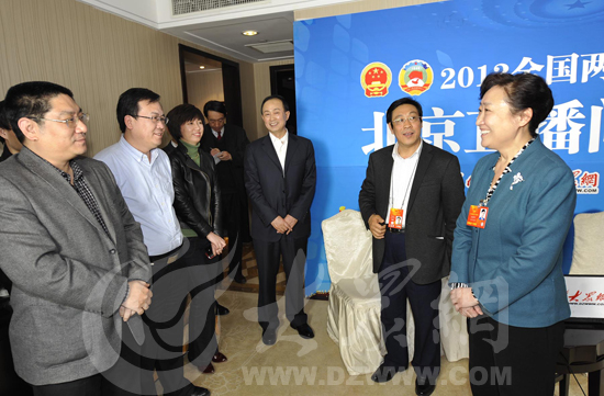 大眾網總編輯朱德泉向翟魯寧介紹大眾網2013全國兩會專題。(特派記者 盛堃 攝)