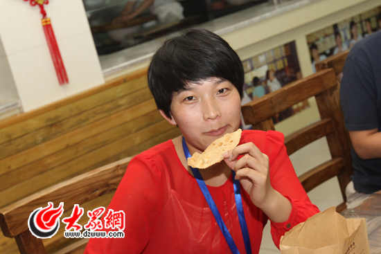 采訪團記者們在大街上的周村燒餅博物館內品嘗剛出爐的周村燒餅。