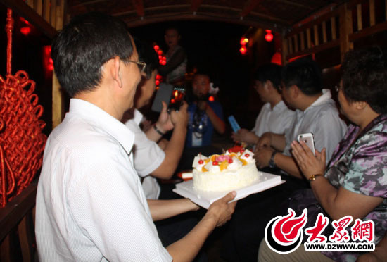 大眾網(wǎng)棗莊6月21日訊記者 郭豪 赫洋 呂斌)“Happy birthday to you,Happy birthday to you……”今天晚上,“聚焦美麗山東—中國網(wǎng)絡(luò)媒體山東行”西線采訪團(tuán)在臺兒莊古城登船夜游采訪,6位在本月生日的采訪團(tuán)成員驚喜地獲得了會務(wù)組精心準(zhǔn)備的奶油蛋糕,在游船上在夜色里,大家共同度過一個歡樂、愜意的夜晚。