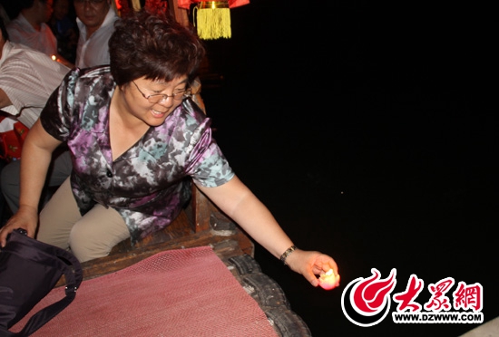 采訪團(tuán)的一位成員將點(diǎn)燃的蠟燭放到水面上。 記者 郭豪攝