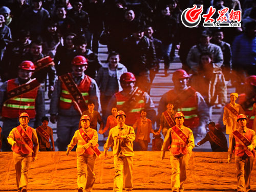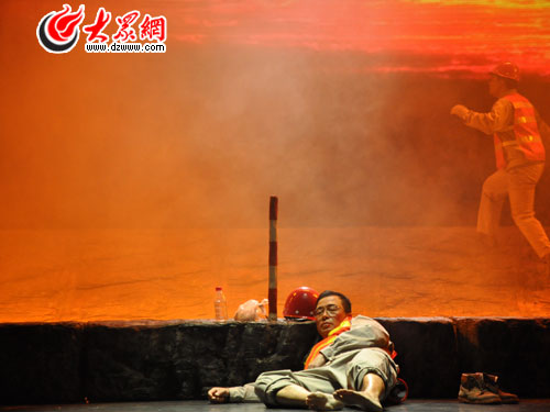 大眾網煙臺10月16日訊 (記者 鐘建) 在電閃雷鳴、暴雨傾盆的夜晚,剛剛獻完血,已經連續工作15個小時的郭明義出現在了搶修礦山公路的搶險現場……16日晚7時30分,根據郭明義事跡改編創作、由遼寧人民藝術劇院創作排演的現實主義話劇《郭明義》在煙臺廣電大劇院上演。