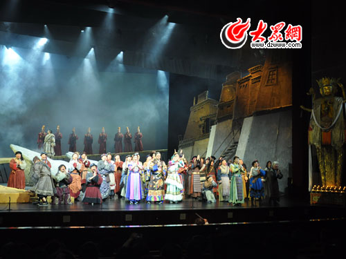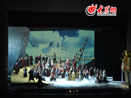 隨著恢宏空曠的交響樂聲響起,幕布慢慢拉起,一幅萬里白云、一望無垠的西藏場景如真似幻的展現(xiàn)在了觀眾的眼前,由當(dāng)代最負(fù)盛名的男高音歌唱家魏松扮演的格桑率先出場,粗狂豪邁的嗓音一亮,便贏得了現(xiàn)場觀眾的陣陣掌聲。