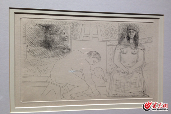畢加索的蝕刻畫《畫家拾筆》。 記者 劉明明 攝